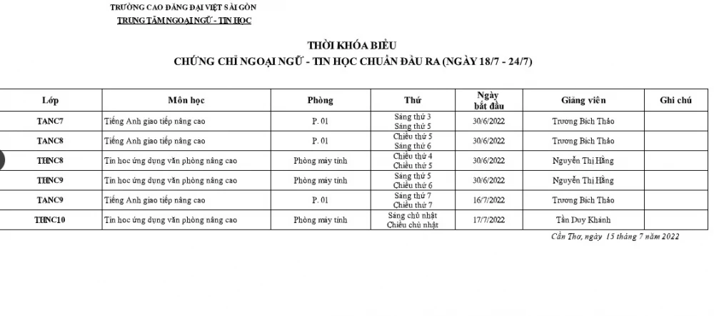 Trường Cao đẳng Đại Việt Cần Thơ thông báo thời khóa biểu học và thi chứng chỉ Ngoại ngữ – Tin học chuẩn đầu ra từ ngày 18/7/2022 đến 24/7/2022, giúp sinh viên chủ động sắp xếp thời gian học tập, ôn luyện và hoàn thành tiêu chuẩn tốt nghiệp đúng tiến độ.